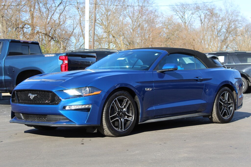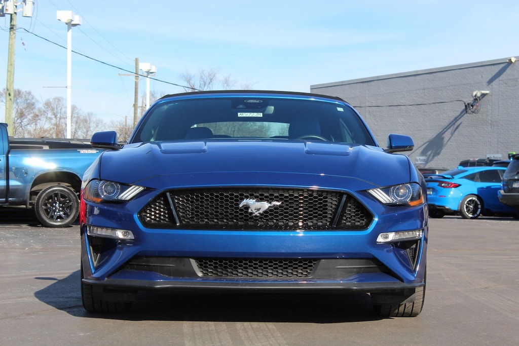 This 2023 Ford Mustang GT Premium Convertible in Atlas Blue Metallic is powered by a 5.0L Ti-VCT V8 engine paired with a 10-speed automatic transmission for strong, responsive performance. The rear-wheel-drive setup delivers classic Mustang dynamics with confident handling. Inside, the GT Premium trim features leather-trimmed seating, heated and ventilated front seats, and a customizable digital instrument cluster. Technology includes SYNC 3 with an 8-inch touchscreen, Apple CarPlay, Android Auto, and a premium audio system. With its power-folding soft top, driver-assist features, and performance-focused design, this Mustang GT Premium blends open-air enjoyment with everyday comfort.
